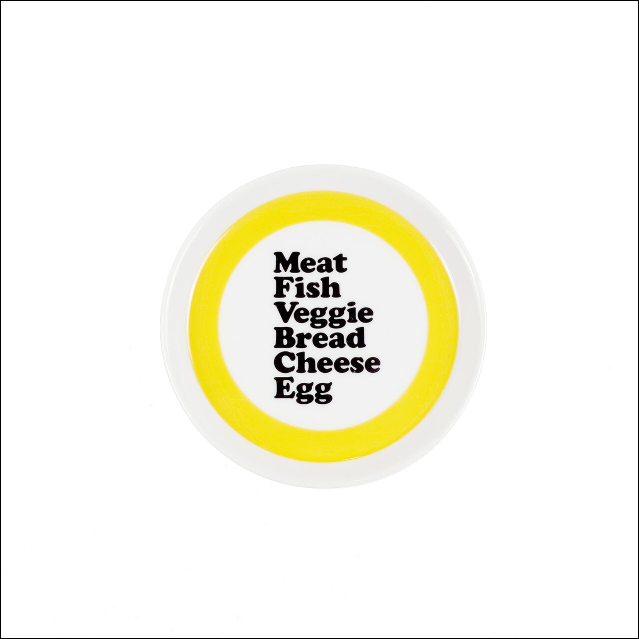 リムの立った少し肉厚で重厚なプレートに、その当時を彷彿とさせるグラフィックと、サイズで異なる3色のカラーリングが施され、盛り付ける食材の周りを囲むような視覚を持たせています。