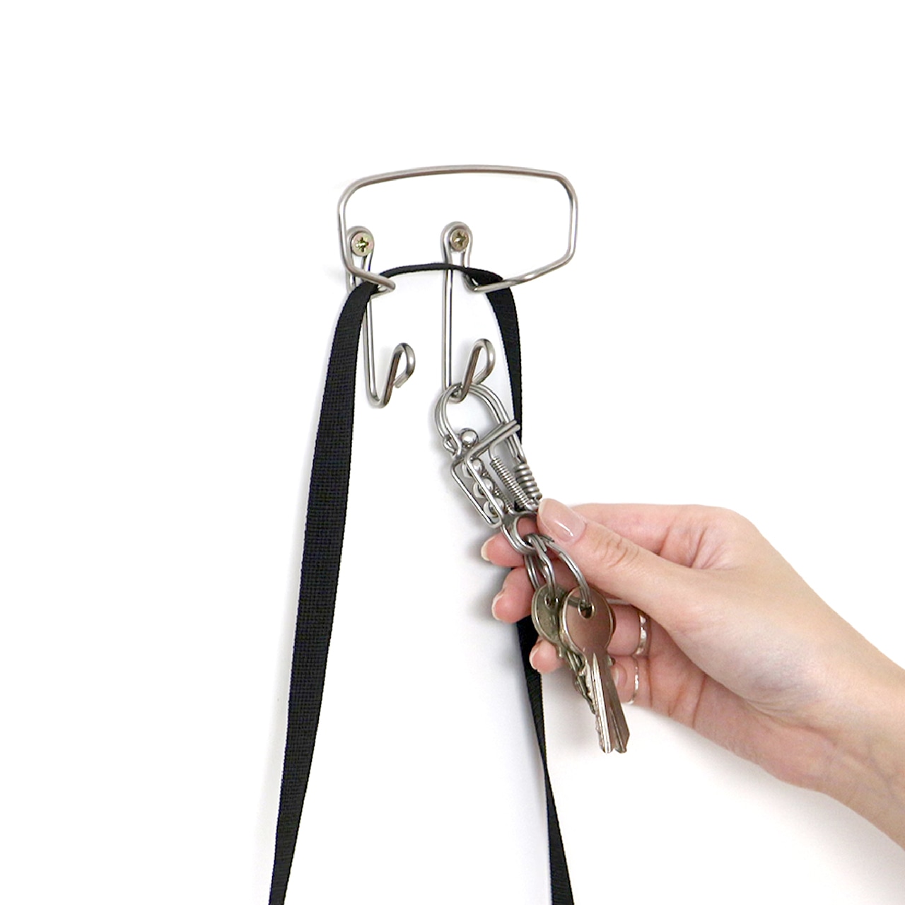 1本のラインから生まれる、立体的なフォルム。上部の横に広がったフックにはコートやバッグ・帽子を、下部の2つの小さなフックにはキーリングを収納可能です。1箇所で複数のアイテムを受け止め、空間を美しく整えてくれます。
