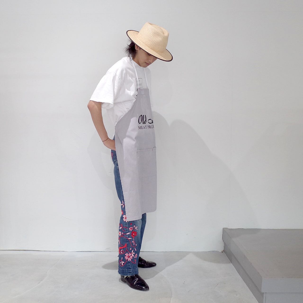 ライトオンスのコットンキャンバスを採用し、首紐、腰紐は柔らかいヘリンボーンテープを使用しております。また製品洗いを施しておりますので、生地の起毛、シワ感、プリントの掠れなど着古した感じが出ております。